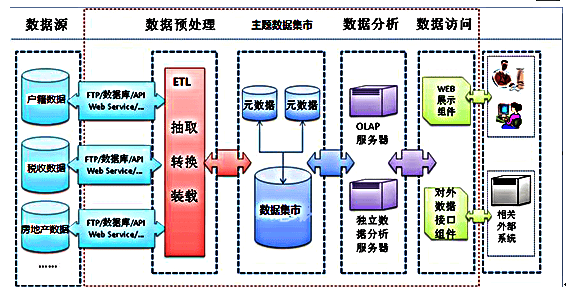 本项目开发的系统名称是主题数据分析平台,系统总体目标是利用ETL工具将数据抽取到数据仓库中,按照数据类型数据分类构建主题数据集市,在此基础上,利用Oracle BIEE软件构建一个数据分析平台,开发智能分析报表,实现丰富的多维图形和复杂表格报表,采用丰富的多维图形和复杂的表格报表技术,以多样化方式展示数据。实现按照税款情况综合分析、纳税人情况綄合分析、税务机关行政管理综合分析、税源分布情况分析等分析主题建立数据中心,用于纳税户分析、票证情况分析、发票情况分析、入库税款情况分析、应征税款情况分析、已缴税款分析、延期税款分析、提退税款分析、减免税款分析、欠税分析、税收收入分析等各类分析。